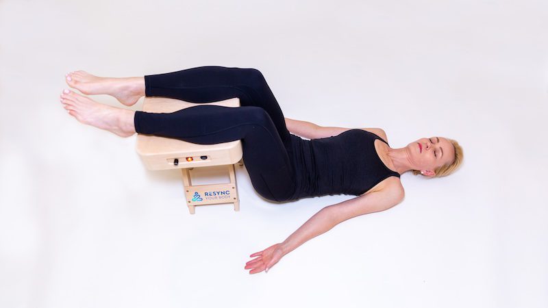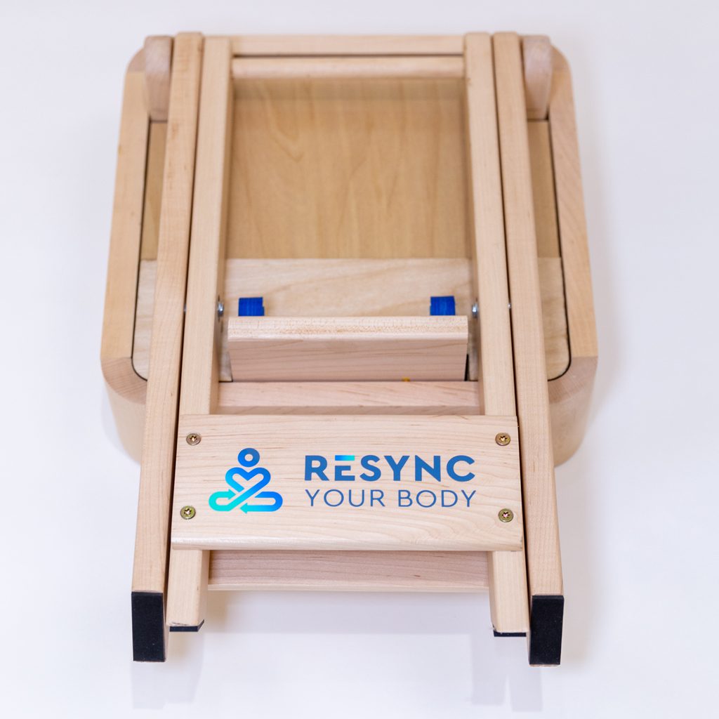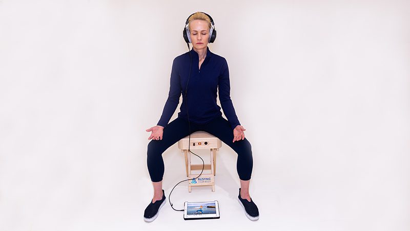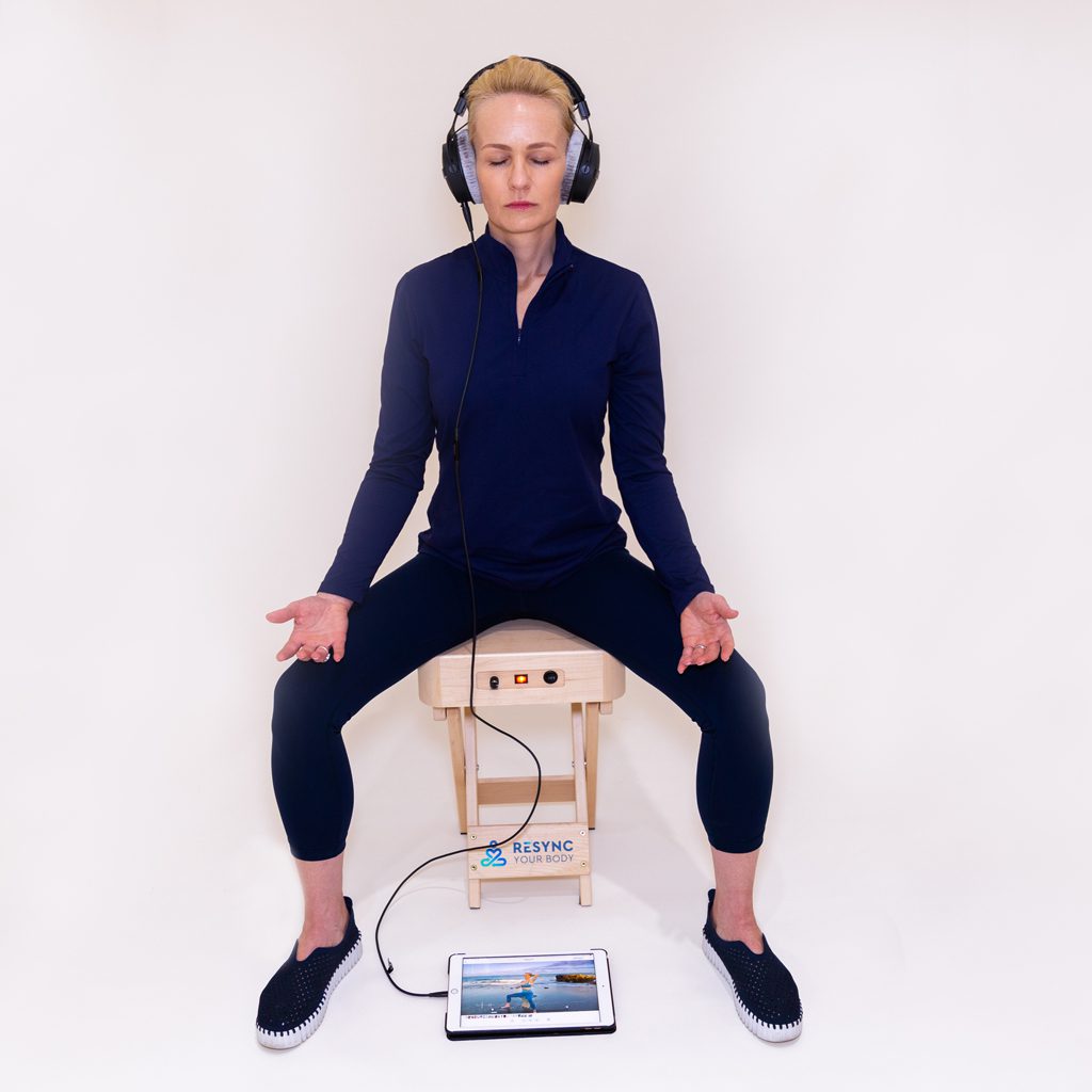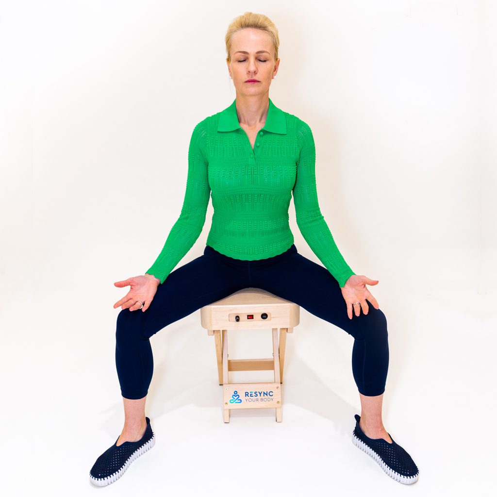 The Resync Your Body chair is intentionally designed to support the body in a healthy, grounded upright posture with an open stance (healthier for the lower back), allowing vibration to travel from the pelvis and sacrum upward through the spine—your body’s central signal tower.